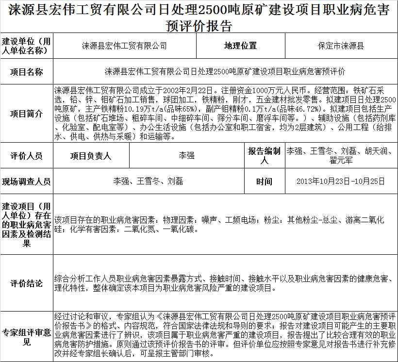 涞源宏伟工贸有限公司日处理2500吨原矿建设项目职业病危害预评价